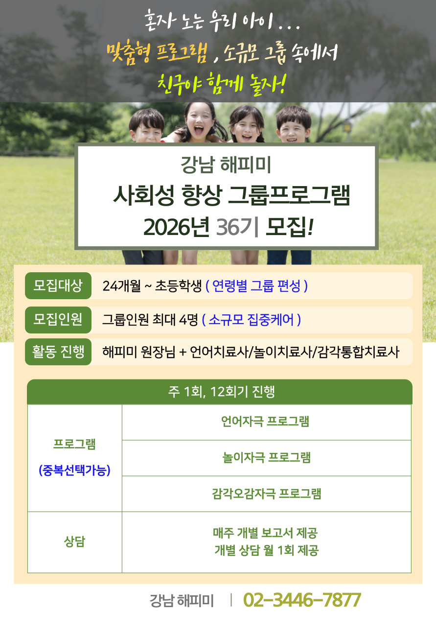 검증된 언어치료사, 감각통합치료사, 놀이치료사 그리고 해피미 원장님이 아이에게 최적합한 또래 그룹을 구성하여 진행하는 사회성 향상 그룹프로그램입니다.